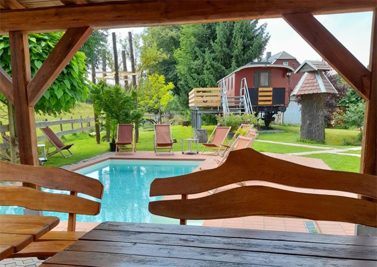 Mitten im schönen Vogtland gelegen, bieten unsere neuausgebauten, modernen Ferienwohnungen "Am Schmalzbach" Platz für bis zu 25 Personen in 4 separaten Wohnungen auf einer Etage im 1. Stock. Besonderes Highlight ist ein umgebauter Eisenbahnwagon mit Platz für 4 Personen. An schönen Tagen lädt das große Außengelände zum Verweilen, grillen oder einer Abkühlung im Pool ein.